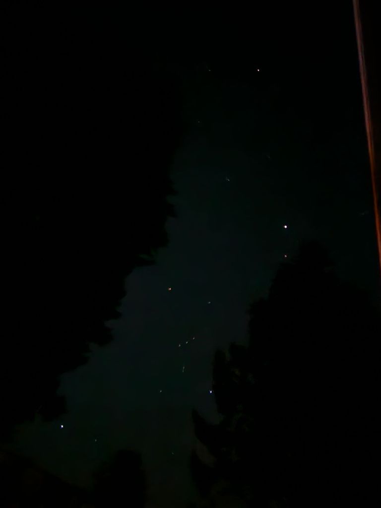 Lit windows flicker in the dark,