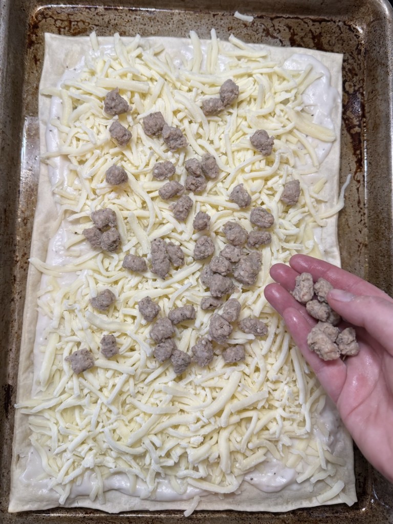 This morning, I found myself craving something very specific: old school cafeteria breakfast pizza. It’s simple really. A soft crust, a layer of sauce, sausage crumbles, and melted cheese.