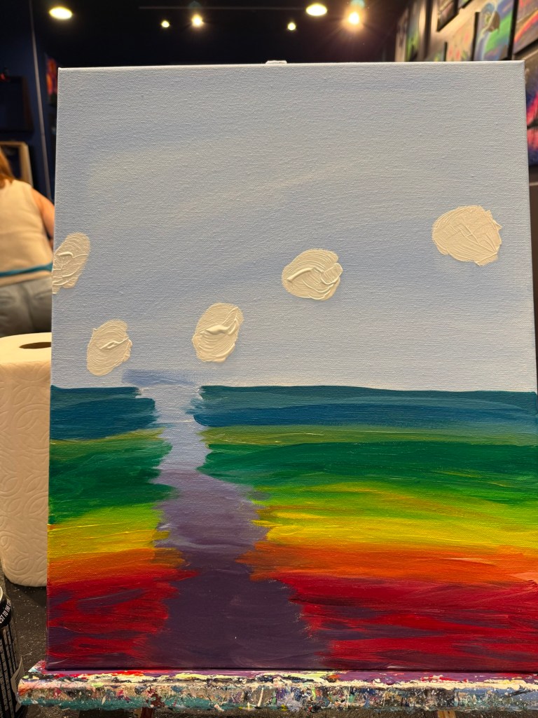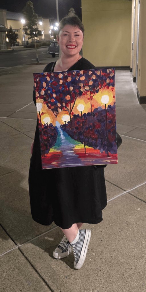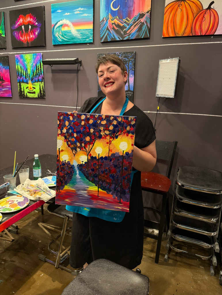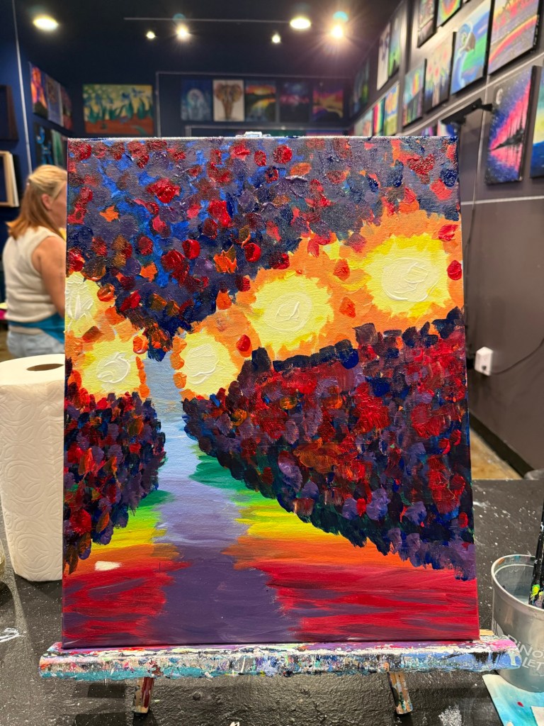 Tonight’s paint and sip felt grounding. As I worked on the canvas, the colors came together in a way that surprised me. So vibrant, alive, and familiar. It reminds me of a rainy autumn night, the kind that makes you feel both reflective and present at the same time. There’s something about putting brush to canvas that slows everything down and lets the week settle. I love this piece, not just for what it looks like, but for how it makes me feel.