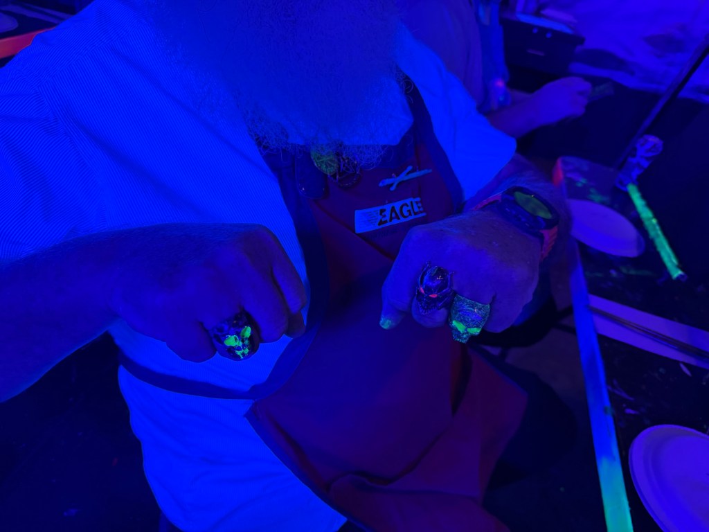 He couldn’t resist showing the camera his rings, which honestly look just as cool under the black light as the paint itself.